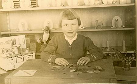 Onderzoek naar en beschrijving van het Noordhorner onderwijs staat eveneens op het ambitieuze programma van de Werkgroep. Hier een foto uit de jaren vijftig met Eika Medema als toenmalige Nutskleuter. Let ook op de entourage!