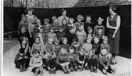 De Nutskleuters uit 1956 met rechts juf Sinie de Jong en twee stagiaires, onder wie juf Wietske Heemstra, die begin dit jaar helaas overleed)