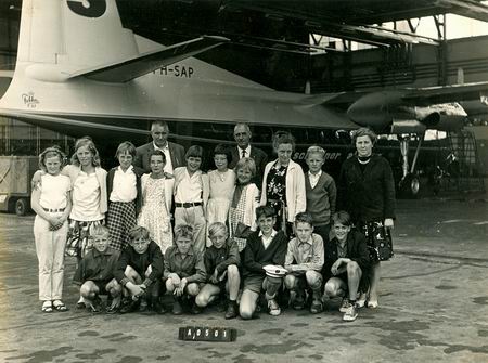 De groepsfoto op Schiphol van de hoogste klassen van de O.L.S. Zuidhorn in de jaren vijftig! Op deze foto staan ook bekenden van en voor Noordhorners. Bijvoorbeeld Kees en Dicky Bakker, meester Hut, Meinema van Briltil.... Ook van deze foto wil ik graag de namenlijst compleet maken. Suggesties? Belangstellenden kunnen van mij een afschrift van deze foto krijgen)