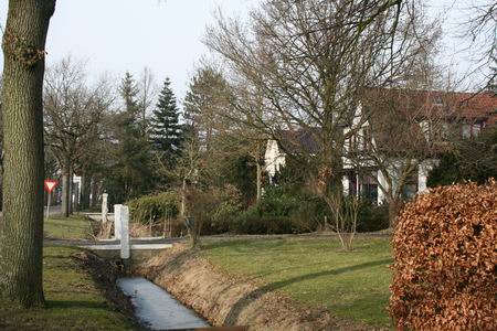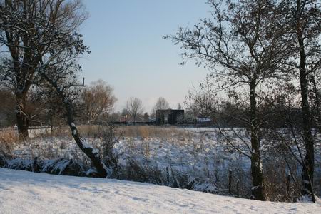 Het terrein aan de westkant van de N355 (weiland Tieneke van der Veen-Pijpker, in april komt hier het circus Renz!), waar het nieuwe knooppunt komt te liggen. Op de achtergrond het woonhuis en de bedrijfsruimte van Freddy van der Veen. Het garagebedrijf is inmiddels verhuisd naar de Handelsweg.