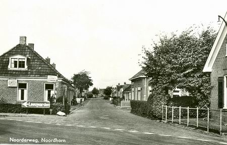 Opvallend natuurlijk de andere verkeerssituatie, de Langestraat als doorgaande weg. De strook bij de heg van De Vries, het aanwijzingsbord met pijl, richting Leeuwarden. (Toen ging er blijkbaar nog veel verkeer tussen Groningen en Leeuwarden door de dorpen…) De witgekalkte kei als ‘verkeersregelaar’, de oude ANWB-handwijzer, het reclamebord op de muur. De dakkapel zit er al, aan de zuidkant van het pand van Sijtse de Vries. Zo te zien is de winkel nog steeds aan de Noorderwegkant, dan zou de foto van voor 1956 moeten zijn…. Het winkelpand van Wigboldy rechts oogt nieuw, iets verderop staat nog een oude gevel, wolfsklem??? (Of heet dat anders?) Noordhorn, meer dan 50 jaar geleden. Herinneringen? Laat maar weten!