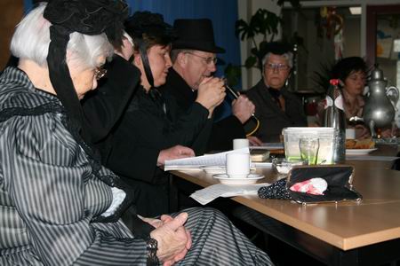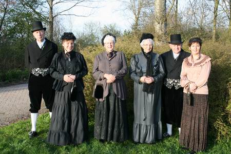 Een statieportret van het huidige ziekenfondsbestuur in karakteristieke kledij uit de 19e eeuw! Van links naar rechts: Kasper Kuper (voorz.), Auktje Kinds (secr.), Harma Postema (penningm.), Annie Pera (adv.lid), Jan Tempel (lid), Grietje Kalf (lid)