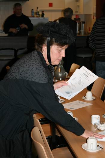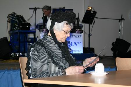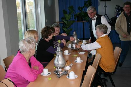 De goedgevulde grote zaal van De Dörpsstee werd voorzien van koffie uit kraantjespotten, de Groninger koek ging er in als... juist! En een lach en een kwinkslag, daar draait ook musicus Johan zijn hand niet voor om!