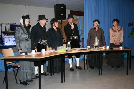 Het voltallige bestuur neemt staande de huldiging van de aanwezige leden en donateurs in ontvangst, aan het eind van het officiële gedeelte. En daarna bleef het nog lang onrustig in en rond de Dörpsstee....