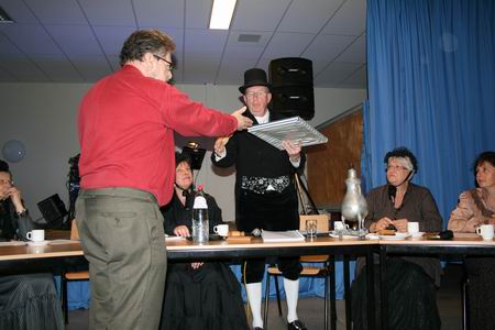 Alle gekheid op een stokje, de vergadering werd wel serieus genomen. Secretaris Auktje Kinds deelt de agenda uit!