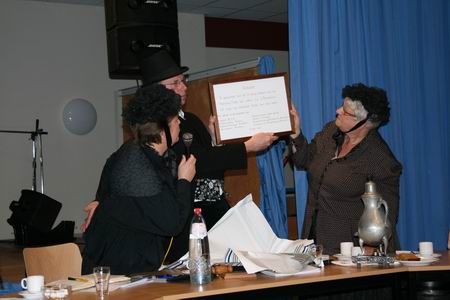 De tekst op het 'getuigschrift' wordt voorgelezen door secretaris Auktje Kinds, het cadeau is bij het bestuur in goede handen!