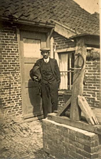 Pieter Bansema in uitgaanskostuum; op de voorgrond de befaamde rolput, die helaas werd méégesloopt...