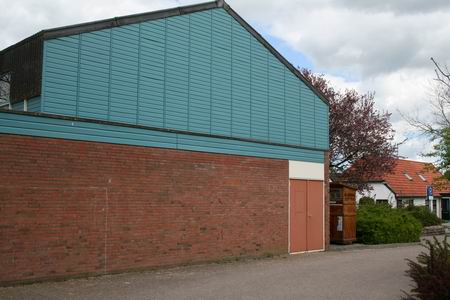 De huidige situatie op de plek waar voor 1970 het huis met bijgebouwen stond van Pieter Bansema; nu staat daar het sportgebouw