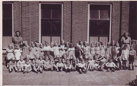 Een foto van de grote kleutergroep met twee kleuterleidsters voor de Nutskleuterschool aan de Achterweg, begin jaren '50, denk ik. Al eerder getoond, maar helaas nog (bijna) geen reactie op gehad. Wie staan er op? Wie een duidelijker afdruk wil, moet het maar even zeggen.