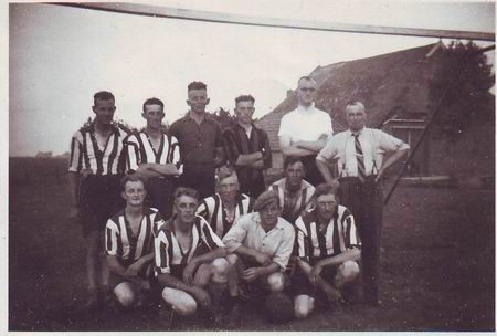 De bijzondere voetbalfoto, toegestuurd door Harry Hekkema vanuit Australië, heeft uiteenlopende reacties opgeleverd. De foto stamt uit 1949, volgens Hekkema, en valt op door het aantal afgebeelde mannen en de wijze waarop ze gekleed zijn…. Ook toén bestond een voetbalploeg toch uit elf spelers + reserves…. Hiér zijn zeven eendere shirts te zien, en twee afwijkende, één keurig overhemd, de tweede zelfs met stropdas en ‘hupzelen’…. En een keeper, mét pet! Digna Achterhof reageerde, ze dacht dat de foto wellicht genomen was bij hun tot woning verbouwde boerderij. Toch niet, de foto is genomen bij de vroegere boerderij van Veenstra (waar nu de familie Stenekes huist). Piet Dijk dacht zelfs dat de foto bij de vroegere boerderij van Holtman aan de Noorderweg was gemaakt. Nee dus… Piet herkende wel meteen Leendert Lodewegen, staande tweede van rechts. Leendert voetbalde niet, staat hier kennelijk als ‘official’. Nog een reactie, van Gerben van der Sluis. Gerben denkt Willy Helmus en Wiebe Jonkman te herkennen, maar die zijn van een jongere lichting. Henk en Marie Hiemstra brengen meer licht in de duisternis. Rechts, met stropdas, Jan Noordveld, naast ‘Laange Leendert’. Verder van rechts naar links: Harm Hekkema, Herman Roeters, Willem Brilstra… Uiterst links staande? Onbekend. En de knielers? Van links naar rechts: Hoite Hiemstra, Wieko Hekkema, Aldert Bakker, keeper Oebel Triemstra, dan een onbekende, en als laatste Kees de Jager… Zo blijven er dus nog twee vraagtekens. Henk Geertsema onderschrijft de namenlijst van de Hiemstra’s. Ook hij kent de naam niet van degene die uiterst links staat, noch van de speler achter Triemstra en De Jager. Henk vertelt verder: “Het boerderijtje was van de familie Veenstra (nu Stenekes), ook volgens Geert Veenstra, kleinzoon van de oude Geert Veenstra. Tot 1941 woonde Geert Veenstra senior op deze plek, in 1942 is zijn zoon Eem(ke) met zijn gezin bij de oude Geert ingetrokken. Voordat er een wedstrijd op het Veenstraveld kon worden gespeeld, moesten eerst de koeien een dag van te voren naar een ander stuk land. Veenstra moest dan eerst de ‘strondebulten’ (koeienvlaaien) opzoeken, en misschien dat er ook wel eens een vlaai vergeten werd… Prima voor slidings… Het veld lag langs de ree (nu Stenekes) en het weggetje naar het witte huisje (voormalig arbeidershuisje Schuiringa). Harm Hekkema was een van de acht inzittenden van de jeep die in maart 1954 in de Langestraat verongelukte. Hierbij kwamen vier mensen om het leven (onder wie Grietje Bloemhof, Hekkema’s vrouw). Harm zelf bleef als enige zo goed als ongedeerd….” (Met dank aan Geert en Agnes Veenstra).