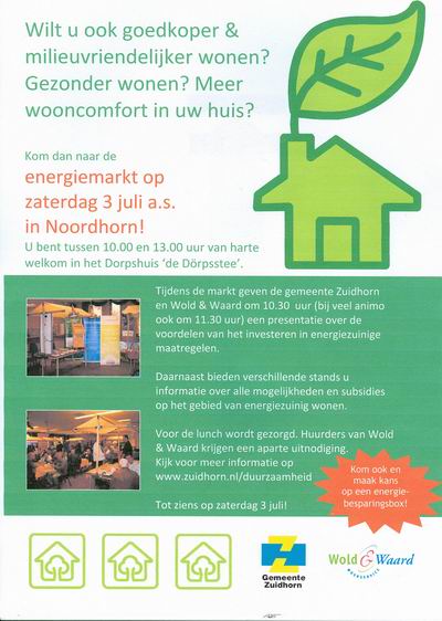 Poster betreffende de ENERGIEMARKT op zaterdag 3 juli a.s. Let op: Huurders van Wold & Waard krijgen een aparte uitnodiging!