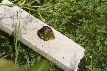 Of er zeven kikkers in deze sloot zitten? Waarschijnlijk nog wel meer... (Al weet ik niet of het piepschuim de waterkwaliteit beslissend aantast...) In ieder geval heeft déze kikker er een podium van gemaakt...