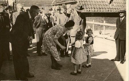 In augustus 1948 vond er een in de Noordhorner geschiedenis onderschatte gebeurtenis plaats, hier in beeld vastgelegd. Toen ik de foto voor het eerst onder ogen kreeg, dacht ik aan onze voormalige koningin Juliana, ‘ergens’ op bezoek. De twee feestelijk geklede meisjes ondersteunden die veronderstelling, vooral door de fraaie hoedjes…. Noordhórn?? Wáár dan wel???! Aan de Oosterweg noordzijde, bij de vroegere Nutskleuterschool die naamloos door het leven ging? O, en wat voor huisje….. Daar rechts? Dat is het oude pand van Pieter Bansema, besproken in een recente “Noordhorn Toen”. Die zonnige morgen (gezien de schaduwen) in augustus 1948 kwam niét de koningin, maar de inspectrice van het kleuteronderwijs naar deze noordelijke contreien. In haar kielzog autoriteiten, onder wie vast en zeker lokale gezagsdragers, al of niet met vestje en horlogeketting. De kleutermeisjes, die zich hier ontspannen tussen al die zondags geklede grote mensen bewegen? Rechts Coby de Vries, dochtertje van Jan de Vries en Anna Hekkema, in het gezelschap van Antje Triemstra, oogappel van pa Oebel en moeke Hiek. (Coby woont in Sneek, Antje is helaas jaren geleden om het leven gekomen bij een verkeersongeluk). Op een kussentje wordt de sleutel van de vernieuwde kleuterschool aangeboden aan mevrouw de inspectrice, die even later het volwassen worden van de school zal bekrachtigen. Geen bewaarschool meer die ‘slechts’ voor opvang zorgde en in het verleden vooral met vrijwilligers werkte, zoals ‘Taande Van der Molen’. Een échte kleuterschool met een speelplan en goed opgeleide kleuterleidsters. Toelating vanaf dit moment op 4-jarige leeftijd (zindelijk of niet….), géén jongere kinderen. Leidster toén was juf Zaagman, niet lang daarna opgevolgd door juf Siny de Jong. Nutsbestuurder Cees de Boer is in beeld en de man rechts? Doet me denken aan Lodewegen, de vader van o.a. Joh. en Leendert. Meer bekenden? Laat het weten! Belangrijk moment uit Noordhorn Toén!