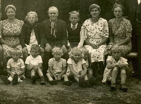Een uitsnede uit de grote groepsfoto met rechtsboven Riek Tempel-Hekkema en op de voorste rij Erica Kellenbach en haar broertje Frits, Frits hier 2e van links, Erica 4e van links)