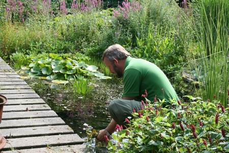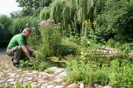 Peter Langebroek in de tuin aan de zijkant, bij de waterpartij met bruggetje, een groen paradijs(je)!
