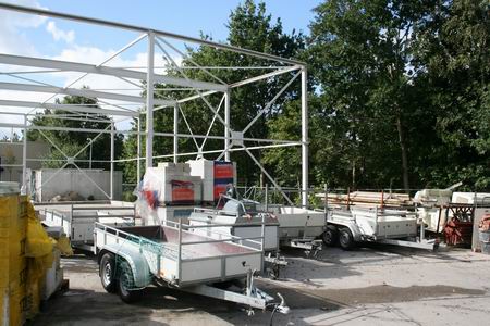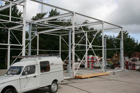 De nieuwe loods als geraamte vanaf de inrit aan de Transportweg. Opvallend het kenmerkende Kooi-wagentje op de voorgrond. Vroeger geïntegreerd in het heden...