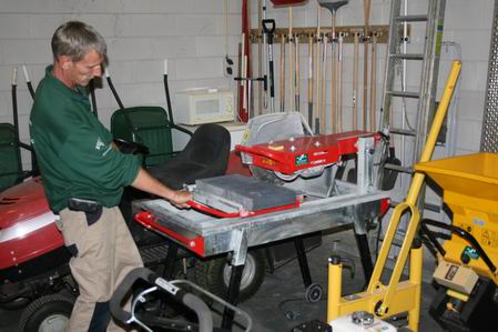 Jacob toont met enige trots zijn ‘machinepark’: Een efficiënte zitmaaier bijvoorbeeld, Jacobs paradepaardje. Of de nieuwe verticuteermachine die het gazon belucht en oude grasdelen en mos verwijdert: “De Mercedes onder de tuinmachines!” Bosmaaiers, heggescharen, bladblazers, bestratingsmaterieel, zoals een flextafel (zie foto – speciaal voor natuursteen en beton). Jacob kan voor de klanten veilig aan de slag en weet precisiewerk te leveren! Alles in goed overleg met de klant. “Samen overleggen we en dan maak ik een ontwerp. De kant van de klant moet duidelijk in beeld worden gebracht! Niet iets opleggen, ádviseren!”