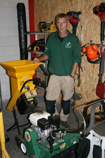 Jacob Visser in zijn bedrijfsruimte, omringd door machinepark en gereedschap, onmisbaar voor de 'groene vakman'!