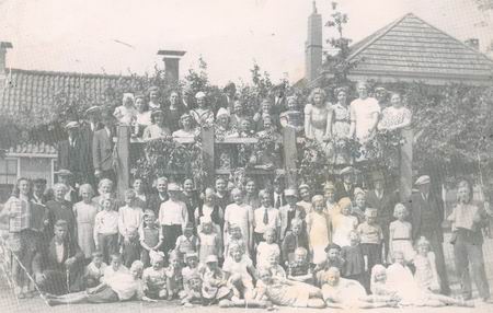 Naast haar moeder en een onbekende vrouw staat Aaltje Vledder, daarnaast Leendert Kazemier. Vervolgens weer een onbekende vrouw en daarnaast Ep de Vries, de vader van Ouktje. Er staan ook drie jongens op met papieren hoeden/mutsen: Jan de Vries (broer van Ouktje), Tjeerd van der Mei en Jouke van der Mei. (With his face down…) De vrouw met de accordeon is A.Hekkema! (‘Her dad had the drukkery in Zuidhorn’) Met de man naast haar is ze later getrouwd (‘can not remember his name’). Daarnaast de oudere vrouw, dat moet dan Griet Triemstra zijn, de 3 jongens zijn niet bekend, de 3 meisjes Antje, Rensje en Grietje Triemstra… Daarnaast twee onbekende jongens, vervolgens Liesbeth Bosman en dan nog weer twee onbekenden. ‘I hope you can unravel all this, if not I will have to come down…’