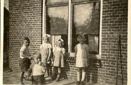 Jimmy (bijna 6) en Harry de Vries bij het huis aan de Langestraat, neem ik aan (nu Koos Mebius). Wie de meisjes zijn? Coby weet het niet meer, misschien toch de zusjes Verhoef?