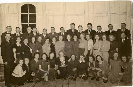 Foto van het gemengde zangkoor "Kunst na Arbeid", 'ergens' in een zaal (1948). Alle namen van de koorleden zijn nog niet bekend. Wie helpt ons verder?