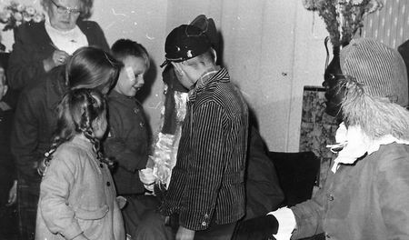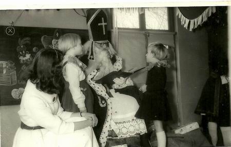 Een foto gemaakt in de Nutskleuterschool, denk ik, met links de juf (juf De Jong, juf Roest?), Sint en enkele kinderen. Wie zichzelf of iemand herkent, graag even doorgeven! Vijftiger jaren, maar wanneer precies?