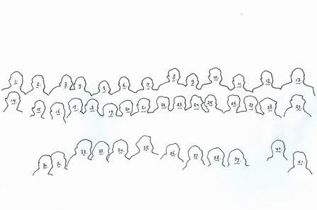 De schets van de koorleden van "Kunst na Arbeid", genummerd