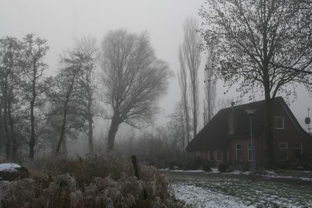 De winterse Mokkenburgweg met het huis waar nu Bert Hekkema woont met zijn gezin, eerder de familie Veenstra, heel vroeger, ver voor de opknapbeurt, o.a. de familie Bargerbos