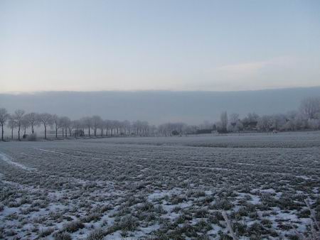 Het winterse weidelandschap zoals dat twee dagen geleden viel te bewonderen vanaf huize Achterhof richting de carpoolplaats bij de Langestraat Noord.