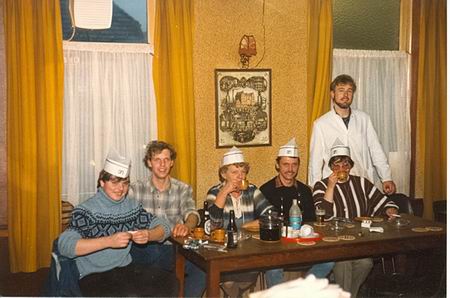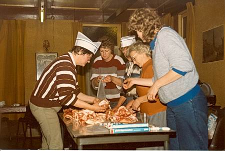 Plm.1980, verdeling varkensvlees bij Sip en Tineke met bekenden als Tine Medema, zussen Bos, mevr.Nanninga....