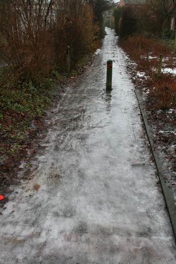 Het verbindingspad tussen Verlengde Oosterweg en Nieuwstraat, nog steeds superglad. Voor vele inwoners van Noordhorn-Noord, wandelend en fietsend, een belangrijke doorgaande verbinding. Prioriteit bij de gemeente? 0,0....