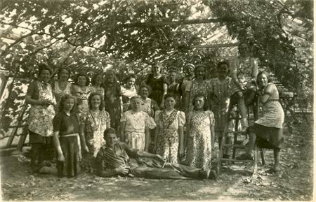 Mevr Veenstra op de knieen is meest links op de foto op de voorste rij in de donkere jurk.