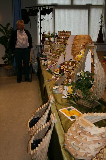 Op de achtergrond ook zo'n boeiende verteller, de bijna 80-jarige imker Kapma uit Noord-Drenthe. "Een bezige bij...", aldus zijn buurman-kraamhouder. Kapma begon als 16-jarige met zijn eerste bijenvolk en is nu nog steeds actief. Nee, nog geen bijenvolk kwijt geraakt door de beruchte ziekte, gelukkig.