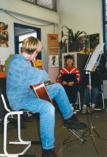 Creatief zijn met muziek... Wat is er nou mooier dan zelf muziek maken, een instrument bespelen? Thuis geleerd, op school gedaan, gitaarspel ter gelegenheid van, ja waarvan eigenlijk? Foto, als ik het goed heb, uit 1998