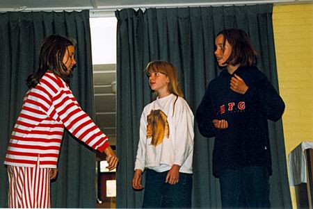 Beeldende vorming is belangrijk, uitbeelden ook! Theaterspel in verschillende uitingsvormen. Hier een impressie van een pantomimespel: geen spraak, geen hulpmiddelen, elkaar niet aanraken... Ook 1998, denk ik, of 1999