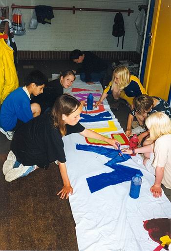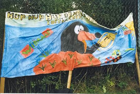 Functioneel kleurgebruik, het maken van een spandoek voor het korfbaltoernooi in Zuidhorn, eind negentiger jaren. Met de inmiddels befaamde mol....