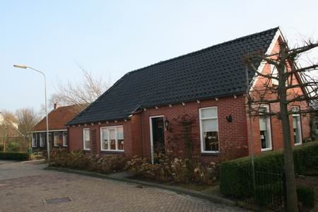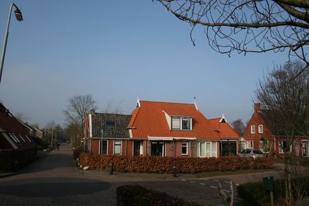 Het dorpsbeeld anno 2011, vanaf de oprit aan de oostkant van huize Bergman. LInks een stukje van het huis van de familie Hoving, vroeger K.Tempel. Dan de Noordwijkweg en het onherkenbaar veranderde huis, waar vroeger Job Veenstra woonde en pleegkind Leendert Meijer opgroeide. In het huis woont nu Leendert Meijers dochter Anja met haar gezin. Rechts nog net te zien het huis van Leendert en Saakje Meijer.