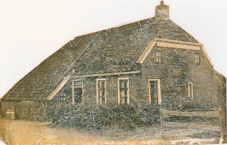 Het oude huis van Fokkinga aan de Moeshorn, dat werd gesloopt. De foto is niet zo best, maar geeft wel een goede indruk van de oude woning. Links, waar de melkbussen staan, was de niet verharde Moeshorn. Melkbussen van Fokkinga? Of had Klaas Tempel (of een voorganger) hier de bussen neergezet? Het huis ligt met de kop naar het westen, net als de nieuw opgebouwde woning waarin de Dijkstra's en Jan Paap woonden, en nu dus Engbert en Iektje Bergman
