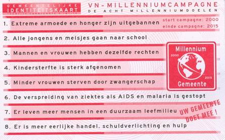 Misverstand. Voorafgaand aan de ledenbijeenkomst is het woord aan gepensioneerd agrariër Feitsma, lid van de “MillenniumWerkgroep”. Verlaat krijgt hij het woord en staat dat voorlopig niet meer af. Acht doelen komen er voorbij en die zouden in 2015 moeten zijn verwezenlijkt. Zuidhorn is een Millenniumgemeente met bijbehorende bordjes die o.a. onder de klok in het gemeentehuis zijn geplaatst. Bij de tijd… (En bij de brug…)