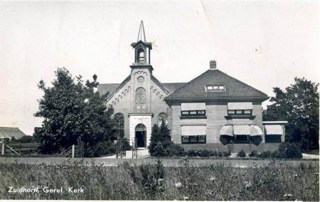 Ik sprak mijn verwondering uit over deze kaart met vier foto’s uit het dorp zelf en de vijfde, de gereformeerde kerk, uit Zuidhorn…. Er kwamen enkele reacties, waaronder die van Meinderd de Vries (oud-Noordhorner, nu Maastricht).  Hij wees er terecht op dat deze kerk weliswaar niet in het dorp Noordhorn staat, maar voor vele Noordhorners wel dé kerk is, midden tussen Noord- en Zuidhorn in. Na de vrijmaking in 1944 en een korte, emotionerende periode waarin het eigendom van het Godshuis werd bestreden, kwam het kerkgebouw met pastorie in handen van de Vrijgemaakt Gereformeerde kerkgemeenschap. Voor de iets kleinere Gereformeerde Kerk Synodaal werd er aan De Gast een nieuw gebouw gerealiseerd. (Nee, het gebouw is onlangs niét verkocht…. Die verkoopaankondiging