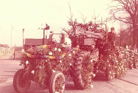 De feestelijke optocht lijkt mij wel 1965 volgens mij staat Meinze Snaak op de wagen en het spoorwachters huisje staat er ook op achter de tractor dit is de overgang in zuidhorn het huis helemaal achteraan is vroeger bewoont geweest door de fam Veltrop.