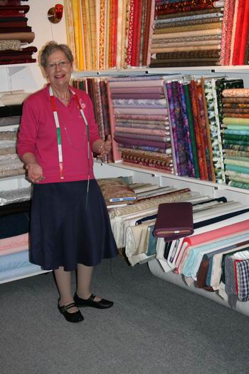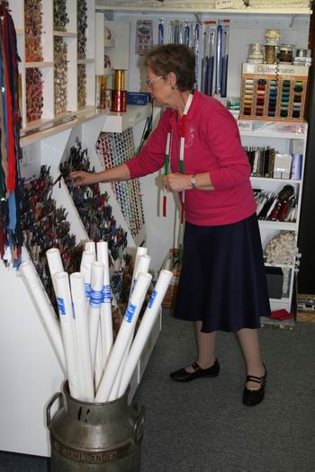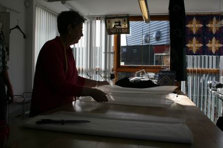 Jikky Wildeboer bij diverse balen stof. Hoewel ze nog steeds veel plezier heeft in haar werk, hoopt ze dat er binnenkort een overnamekandidaat op de stoep staat