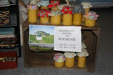 Een 'kraampje' in de winkel met Roemeense honing; de opbrengst komt ten goede aan minder bedeelde mensen in dit Oost-Europese land waarmee de Wildeboers warme banden onderhouden