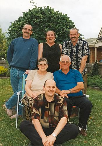 De Renkema's in Australië verenigd, Kerst 2001. Michel op de voorgrond. Tjaard en Lies in het midden, Rick, Coby en André staande!
