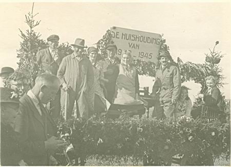 Nog eens de enigszins verbleekte foto, die ik kreeg via Jan Spoelstra, afkomstig uit het fotoalbum van zijn moeder, mevr. Spoelstra-Casemier. De foto is genomen tijdens een bevrijdingsoptocht. Jan Spoelstra zijn vader, Sjoerd Spoelstra, staat op deze foto, rechts van het bord, de hoeddrager. Vlak achter hem, rechts, zit zijn vrouw, mevr.Spoelstra-Casemier. Maar wie zijn de andere mensen op de wagen????? En wie staan er links op de voorgrond???