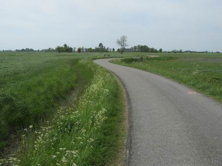 Het kronkelige einde van de Jensemaweg aan de westkant, daar waar deze weg uitkomt in de Noordhornerweg. Weinig tot geen verkeer, veel fleurigs als fluitekruid, boterbloemen en uitgebloeide paardebloemen. En verre einders...