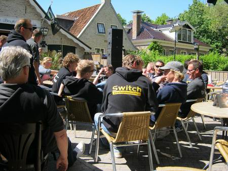 Kijk es aan, wie hebben we daar op het zonnige terras van befaamd eilandetablissement "It Aude Beuthûs"? Richard Kikstra, de frontman van "Switch", hier van achteren gekiekt op een zonnige zaterdagnamiddag, halverwege mei 2011. Temidden van andere bandleden en KUGgers!
