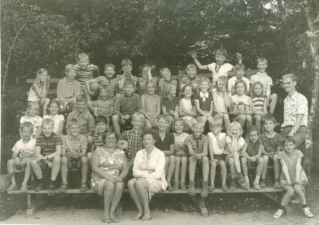 Wie staan er op deze foto? Op de voorgrond twee begeleidende moeders: mevr.W.ten Cate-Wegter en mevr.J.Posthumus-Wijnalda; rechts op dezelfde bank Johan Vermue; de rij daarachter v.l.n.r.: Wim ten Cate, Dirk Hoogstra, Marcel Schuttenbeld, Albert de Jong (later Noordhorner), Ceico Wijgerts, Pop Ansing, Margaretha Boonstra, Lex Guichard, Hilda van der Veen, Gea van der Bij, Irmgard Kamphuis, Tonny Feldbrugge; rijtje van drie daarboven: Fanny van der Hurk ? (Amerikaans meisje dat een half jaar in Zuidhorn verbleef), Jenny Kliphuis, Wietse Lap; rij daarachter: Arie Loer, Sjors Klaver, Hanny Jeltsema, Annemarie Timmerman, Fenny Smit, Hanny Detmers, Anja Scheeringa, Triska Renkema, Gea de Bruin; bovenste rij: Anita Cley, Johan Rogaar, Ben Takkenkamp, Henk Posthumus, Ron Iwema, Erik Jan Bosma, Jan Roelf Wijgerts ?, Bert Hofman, Jan Jansen, ??????????, ? Schoot.... (Valt me mee dat ik de meeste namen nog ken, maar of ze allemaal kloppen...)