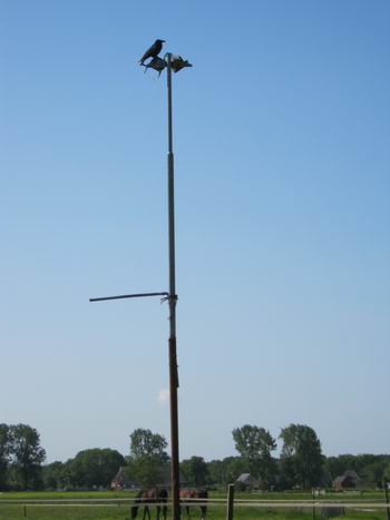 Een zwarte kraai op zijn uitkijktoren, de mast op het land van Jacob Tempel, langs het betonpad richting Den Ham. De paarden beneden als contrast...