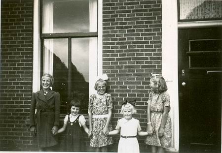 Van links naar rechts: Lena Wieringa (nu Norg, van haar is de foto afkomstig); Annie Diephuis (nu Hoogkerk); Elleke Kloosterman (nu wonend aan de Burchtwal in Zuidhorn); Reina van der Veen (weet ik niet waar ze nu woont….) Het vijfde meisje rechts bleef onbekend. Ze kijkt opzij, dat maakt herkenning moeilijker. Gisteren een telefoontje gekregen van Elleke Kloosterman, die al jaren als Elleke Nanninga(-Kloosterman) door het leven gaat (na een werkzaam bestaan als o.a. Spar-winkelierster in Niekerk). Zij vertelde dat het vijfde meisje rechts Roelie Renkema is, destijds evenals Elleke wonend aan de Nieuwstraat (schuin tegenover elkaar).  De heer Wieringa, graancommissionair (de vader van Lena, maar ook van Jan en Jaap) heeft de foto gemaakt (voor zijn huis aan de Langestraat, nu familie Den Boef) en zorgde ervoor dat elk meisje een afdruk kreeg.